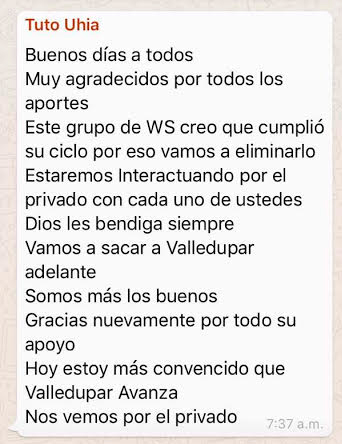 “Este grupo de WS creo que cumplió su ciclo por eso vamos a eliminarlo. Estaremos interactuando por el privado con cada uno de ustedes. Dios les bendiga siempre, vamos a sacar a Valledupar adelante, somos más los buenos”, dice el mensaje.