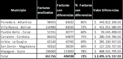 De acuerdo con los resultados, hubo una afectación del 60% de las facturas revisadas de las cuales 30.777 presentan un valor diferencial de $93.045.498.