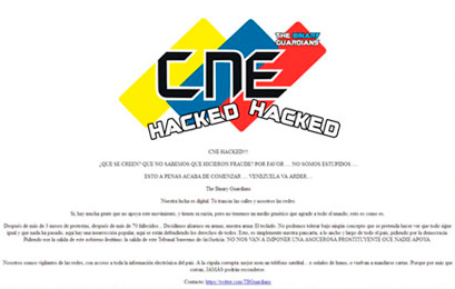 Casi dos horas duró caída la página web del Consejo Nacional Electoral (CNE) de Venezuela luego de que, a primera hora, un grupo de piratas informáticos identificado como “The Binary Guardians” hackeara el portal.