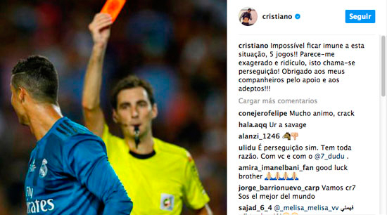 El portugués Cristiano Ronaldo explotó hoy tras conocer la ratificación de la sanción de cinco partidos por parte del Comité de Apelación y afirmó en su cuenta de Instagram que «es exagerado y ridículo».