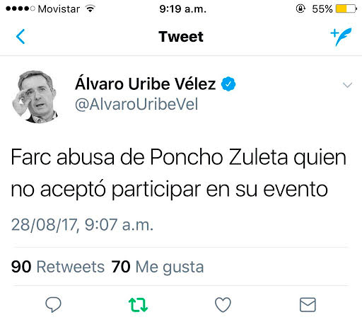 En un trino el expresidente y senador Álvaro Uribe Vélez dijo que “Farc abusa de ‘Poncho’ Zuleta, quien no aceptó en participar de su evento”, pero no hizo claridad del abuso. Con Miguel Barrios- EH