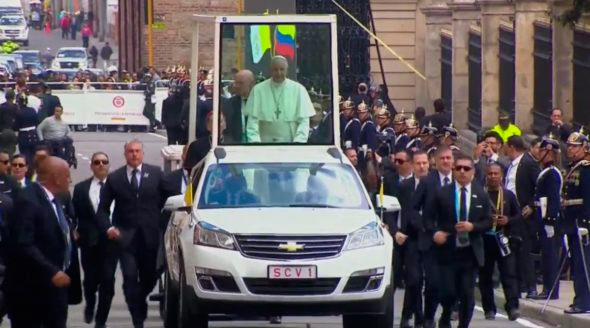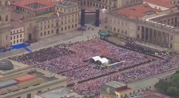 De la Casa de Nariño, luego de sostener una corta reunión privada con el presidente Juan Manuel Santos, el Papa Francisco salió hacia la Plaza de Bolívar, donde fue recibido por una multitud de más de 20 mil jóvenes.