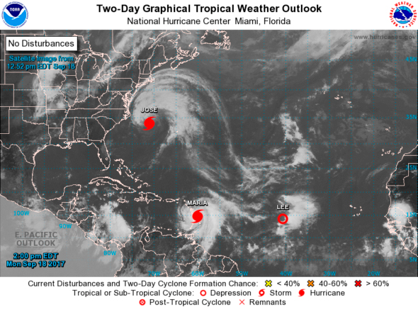 El Centro Nacional de Huracanes emitió advertencias también sobre el Huracan Jose, localizado a cientos de millas al este de Cape Hatteras, Carolina del Norte y sobre la Depresion Tropical Lee, localizada sobre el este del Oceano Atlantico.