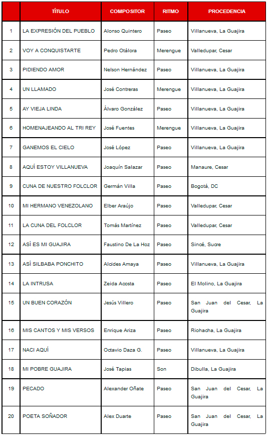 20 canciones llegarán a la primera ronda eliminatoria en el marco del 39° Festival Cuna de Acordeones de Villanueva, La Guajira que se llevará a cabo del 21 al 23 de septiembre.