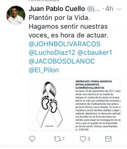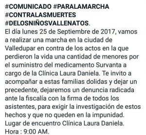 Con un mensaje en el que invitan a toda la comunidad de Valledupar a movilizarse este lunes 25 de septiembre como protesta por la muerte de 16 bebés prematuros en la clínica Laura Daniela, a los que les habrían suministrado medicamentos adulterados, promueven la marcha en las redes sociales.