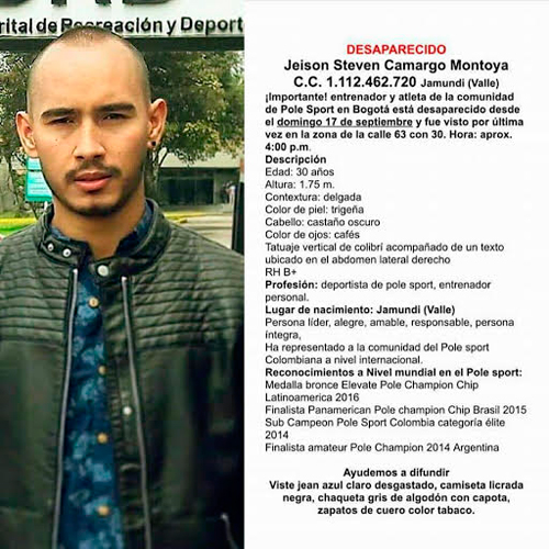 Amarrado de las manos a un lado de la carretera, entre los municipios de El Molino y San Juan del Cesar, Guajira, fue encontrado el deportista y dueño de Pole Xtream, Jeison Stiven Camargo Montoya, desaparecido desde el 17 de septiembre en Bogotá.