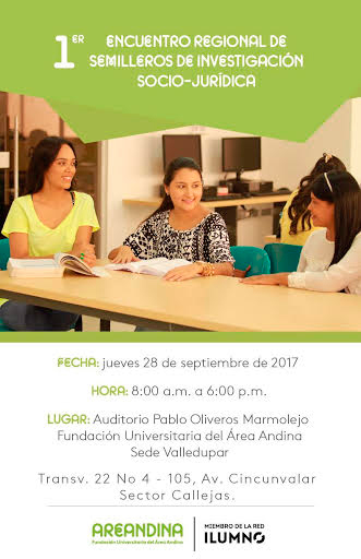 El programa de Derecho de la Fundación universitaria del Área Andina realizará este jueves 28 de septiembre el ‘I Encuentro Regional de Semilleros de Investigación Socio- Jurídica: Derechos Humanos y Postconflicto’.