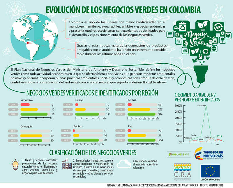 En Colombia se han identificado 796 negocios verdes entre 2014 y 2016, en el marco de la implementación de los Programas Regionales de Negocios Verdes, que han generado 4.332 empleos directos y alrededor de 81.127 millones de pesos en ventas.