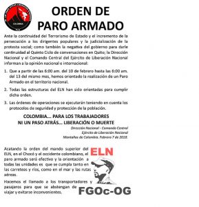 El paro armado fue una decisión de la Dirección Nacional y el Comando Central del Eln, que agrega que la orden debe cumplirse «en las carreteras, ríos, como en el mar y las rutas aéreas».