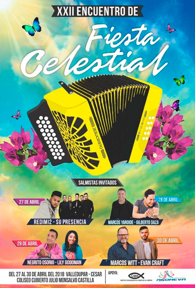 El primer día de Fiesta Celestial 27 de abril, será abierto con los conciertos del rapero dominicano Redimi2 y la banda Su Presencia, de Bogotá. El 27 de abril estarán Marcos Yaroide y Gilberto Daza y el 29 de abril estarán Dagoberto el Negrito Osorio y Lily Goodman que llegará de República Dominicana.