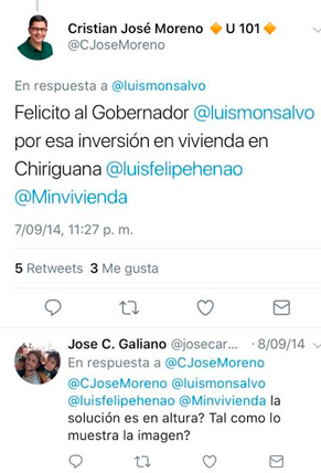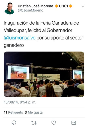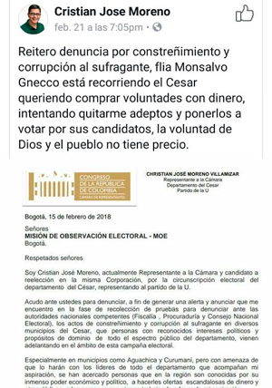 Como se nota que el actual congresista y candidato a la cámara por el partido de la U, Cristian Moreno Villamizar no cuenta esta vez con el apoyo de la casa Monsalvo Gnecco en sus aspiraciones. Cuatro años atrás cuando se sintió en el cielo, se sobraba en elogios de las acciones del gobierno departamental y ahora que no tiene el apoyo, los acusa de constreñimiento. Cosas de la política.