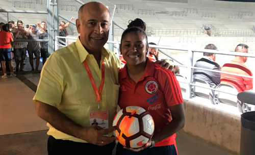 Mairet Pérez por marcar tres goles en un solo juego tiene derecho al balón que aquí le entrega otro vallenato, Jesualdo Morellis, delegado de Fedefútbol para esta selección femenina.