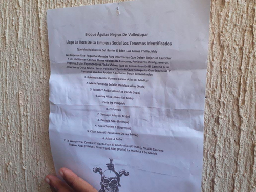 En una sola hoja e identificándose como ‘Bloque Águilas Negras de Valledupar’ dicen que tienen ubicadas a las personas que realizan atracos y consumen alucinógenos de los sectores del Eden, Las Torres y Villa Haidith a quienes amenazan con atentar contra sus vidas.