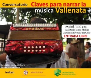 En Valledupar se realizará conversatorio ‘Claves para narrar la música vallenata tradicional’. En el marco de las actividades culturales previas al Festival de la Leyenda Vallenata, la Dirección de Comunicaciones del Ministerio de Cultura y la Facultad de Bellas Artes de la Universidad Popular del Cesar invitan al conversatorio, ‘Claves para narrar la música vallenata tradicional’, este jueves 19 de abril a las 3:30 p.m. en el auditorio Jaime Molina, en la sede de Bellas Artes.