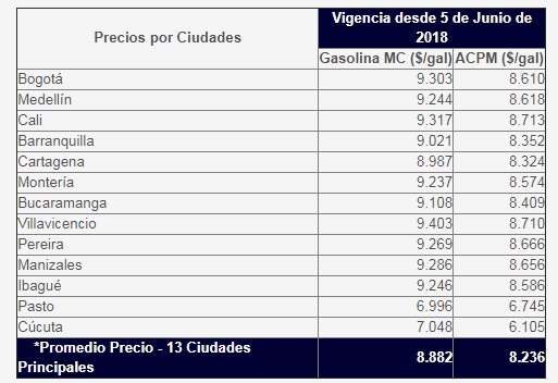 A partir de este martes 5 de junio de 2018 se ajustan los precios de referencia de los combustibles, de acuerdo con la resolución expedida por el Ministerio de Minas y Energía. El precio del galón de gasolina corriente para las 13 principales ciudades del país, sube en promedio 161 pesos y el del ACPM, 154 pesos.