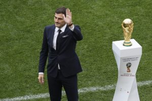 Los encargados de llevar la Copa del Mundo al centro de juego fueron el exjugador español Iker Casillas y la modelo rusa Natalia Vodianova.