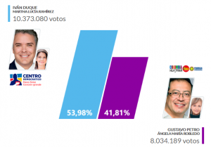En segunda vuelta, de acuerdo con los últimos boletines de la Registraduría, contabilizado el 100% de los sufragios y 97.663 de las 97.663 mesas, el candidato presidencial Duque y la candidata a Vicepresidente Martha Lucía Ramírez obtuvieron 10.373.080 votos, mientras que la fórmula de Gustavo Petro y Ángela Robledo tuvo 8.034.189.