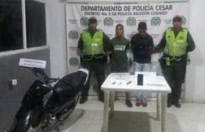 Un ciudadano transitaba por las calles de Codazzi, cuando dos personas que se movilizaban en una motocicleta lo interceptan y tras intimidarlo con armas blancas, lo despojan de su celular de alta gama “De manera inmediata, y gracias a la información de la comunidad, las patrullas del cuadrante reaccionan y a pocas cuadras logran interceptar a estos sujetos”, dijo la Policía.