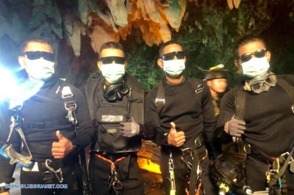 Trece buzos extranjeros expertos en buceo en cuevas y cinco rescatistas de la armada tailandesa participaron el domingo en la primera operación que sacó a los primeros cuatro niños de la cueva. Los rescatistas tardaron 11 horas en la misión. Otros cuatro niños fueron rescatados el lunes por el mismo equipo.