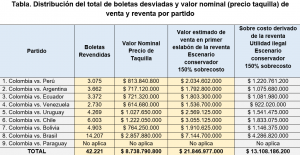 La Superintendencia de Industria y Comercio pudo establecer que el precio de taquilla (valor nominal) de las 42.221 boletas desviadas masivamente con fines de reventa equivale a una suma superior a los $ 8 mil 700 millones de pesos y que en un escenario conservador estimado con base en las pruebas que obran en el expediente, sobre los valores en que Ticket Ya revendía las boletas en el primer eslabón de reventa, esas 42.221 boletas hubiesen podido generar ingresos a los revendedores integrantes del autodenominado “Grupo / Socios Ticket Ya” en el primer eslabón de reventa por más de $ 21 mil 800 millones de pesos, aproximadamente con una utilidad de más de 13 mil millones de pesos.