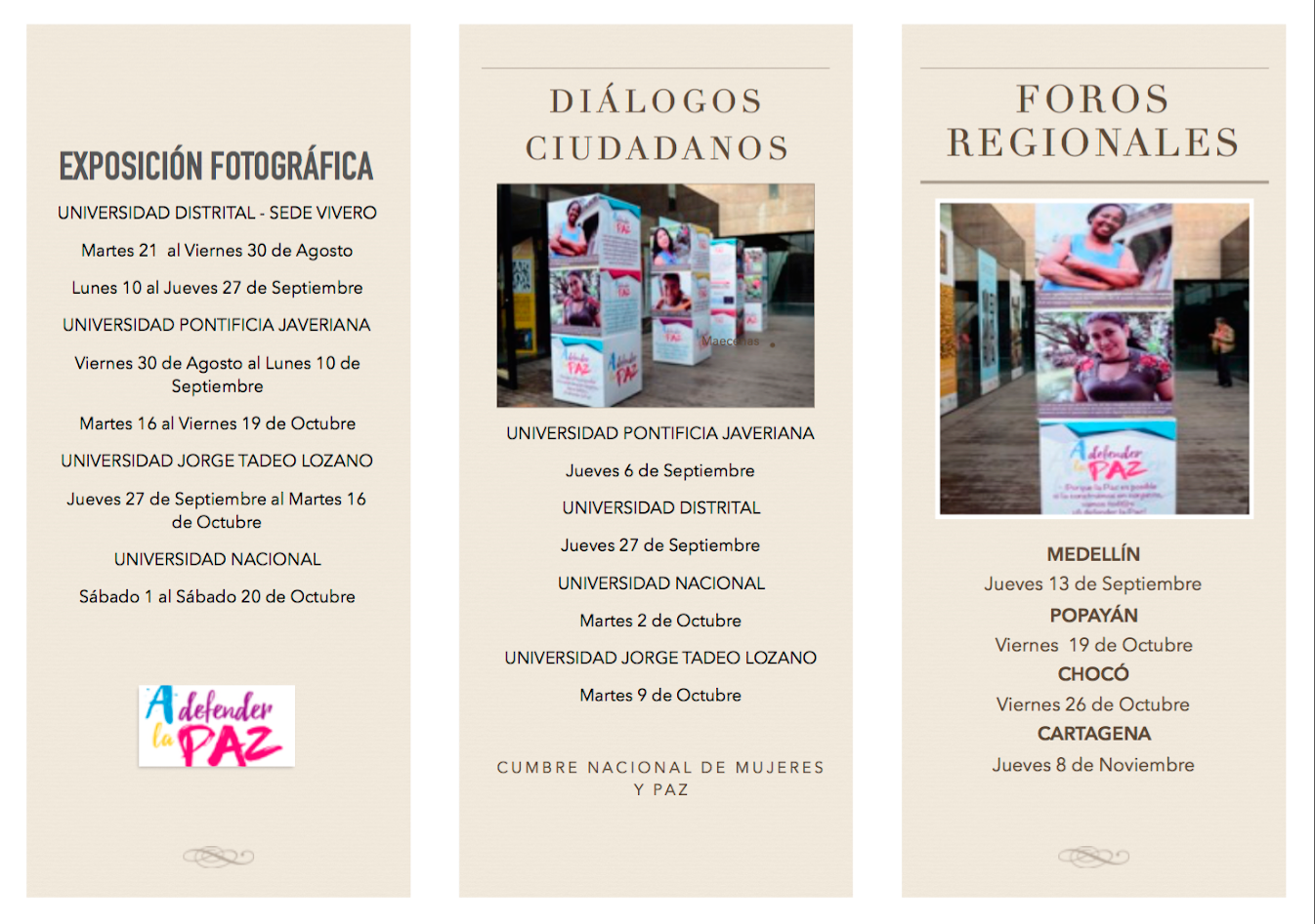 Para cerrar con la campaña se llevarán a cabo cuatro foros regionales en Medellín, Popayán, Chocó y Cartagena que buscan establecer el significado de la paz para las mujeres, su trabajo en las comunidades, la importancia de la construcción de la paz por medio del género, impartiendo la cátedra con un solo eje central: ‘A Defender la Paz’.