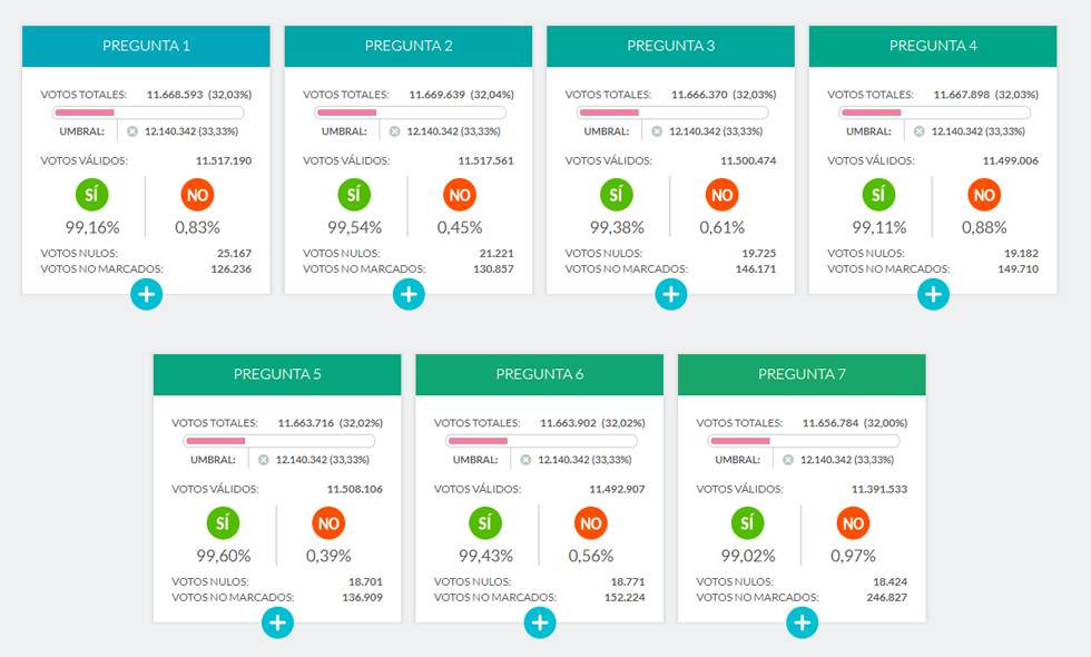 Además, los 11,6 millones de votantes que participaron en la consulta se inclinaron por darles el sí a las siete preguntas contenidas en el tarjetón, todas con una aprobación de más del 99%.