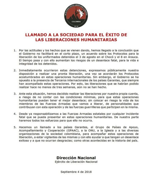 Los cabecillas del Eln responsabilizan a las Fuerzas Armadas “por cualquier incidente fatal que se pueda presentar en estas operaciones humanitarias”.