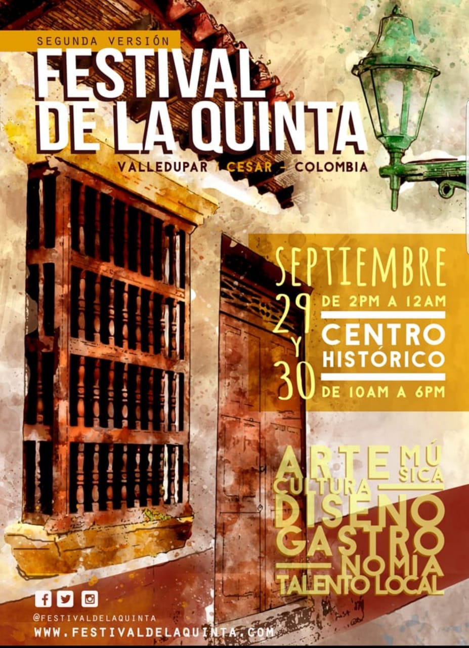 Este año, en su segunda versión, el Festival de la Quinta será de dos días, iniciará el sábado 29 a las 2 de la tarde concluyendo a las 12 de la media noche y continuará el domingo entre las diez de la mañana y las seis de la tarde; al respecto Cristina Zapata una de las organizadoras del Festival hizo un llamado para que “se apoye el emprendimiento y se respalde a todas las personas que hacen el esfuerzo para tomarse el centro histórico. La idea es que se aprecie la oferta cultural que se tiene en el Cesar. En esta oportunidad el festival esta diseñado para el disfrute de toda la familia, al tiempo que buscamos visibilizar el centro histórico de la ciudad al igual que la primera versión que se realizó el 26 de agosto de 2017”.