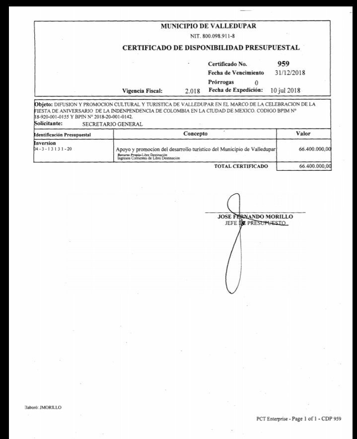 Entre las actividades que debía desarrollar la Fundación ‘Salud por la Vida’, estaba llevar una muestra del vallenato tradicional a México, incluyendo un homenaje a “un importante intérprete de la música vallenata”, pagarle boletos de avión ida y vuelta y hospedajes. Sin embargo, y a pesar que el objeto del contrato era “el apoyo a la gestión para la difusión y promoción cultural y turística de Valledupar en el marco de la celebración de la fiesta de aniversario del Día de la Independencia de Colombia en México’, en la propia capital del Cesar se desconoce cuál fue el artista que recibió dicho reconocimiento, dónde y cuándo, si las fechas no coinciden.