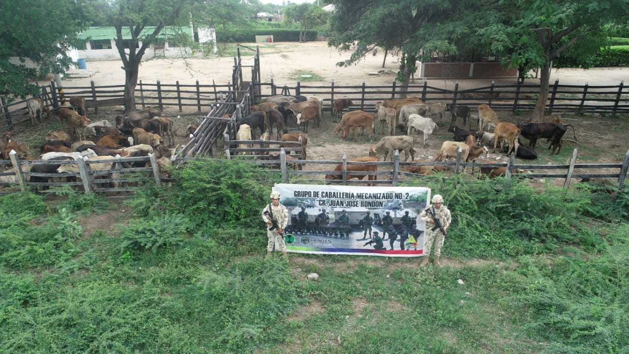 En operaciones de control territorial adelantadas por unidades Tácticas de la Décima Brigada adscrita a la Primera División, incautaron en dos zonas diferentes de la Guajira, 100 cabezas de ganado de procedencia extranjera, al parecer perteneciente a la comisión de finanzas de alias Patricia de la Compañía Mixta Libardo del Grupo Armado Organizado Eln.