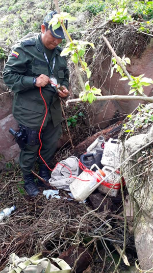 En el lugar se hallaron cinco artefactos explosivos en recipientes plásticos, uno en recipiente metálico, ocho kilogramos de explosivos pólvora negra, cinco kilogramos de explosivo amonal, 12 metros de cordón detonante y un radio base con sus accesorios.