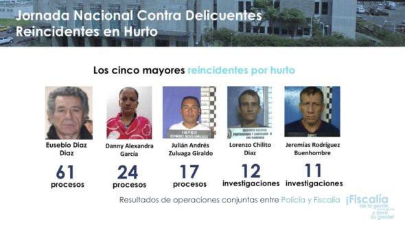 Eusebio Díaz Díaz: capturado en 61 oportunidades por hurto, muchos de ellos a establecimientos comerciales. En las investigaciones, la Fiscalía conoció que en 2009, fue condenado en España por el delito de hurto. El proceso más reciente que se le sigue está a cargo de un fiscal seccional de Bogotá.