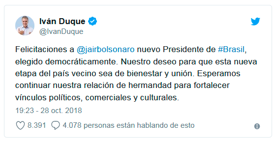 “El Ministerio de Relaciones Exteriores, en nombre del Gobierno de Colombia, felicita al pueblo y el Gobierno de Brasil por el espíritu democrático demostrado en la exitosa jornada electoral donde se eligió al candidato del Partido Social Liberal, Jair Bolsonaro, como nuevo Presidente de Brasil.
