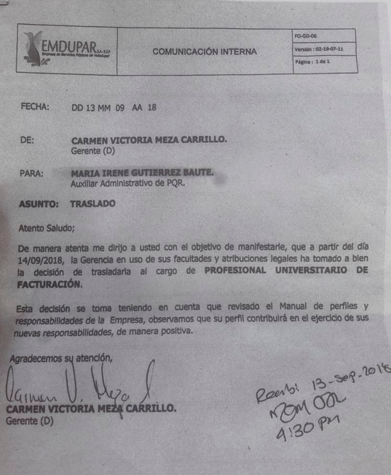 Mediante comunicación interna del 13 de septiembre de 2018, firmada por Carmen Victoria Meza Carrillo, quien para la fecha actuó como Gerente delegada de Emdupar, se le notificó a María Irene Gutiérrez Baute, en ese entonces Auxiliar Administrativo de la sección PQR, que había sido trasladada al cargo de Profesional Universitario del área de Facturación.