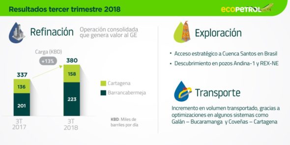 El segmento de Refinación tuvo un desempeño operativo sobresaliente en el trimestre alcanzando un nuevo máximo histórico de carga estable con 380 mil barriles por día para las dos refinerías. El tercer trimestre ha sido el mejor del año en cargas y margen de refinación para cada una de las refinerías.