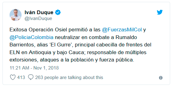 El presidente Iván Duque confirmó que en un operativo realizado por las Fuerzas Militares y la Policía fue abatido Rumaldo Barrientos, alias “el gurre”, principal cabecilla de los frentes del Eln que operan en el Bajo Cauca, en el departamento de Antioquia.