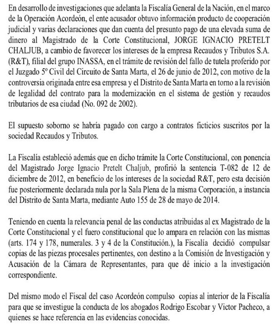 Por un nuevo hecho de corrupción, la Fiscalía General de la Nación pidió a la Comisión de Acusación de la Cámara Representantes que investigue al magistrado Corte Constitucional, Jorge Ignacio Pretelt Chaljud. Según el organismo investigador Pretelt habría recibido una alta suma de dinero para favorecer en fallo de tutela a Recaudos & Tributos SA, filial de la empresa española Inassa.