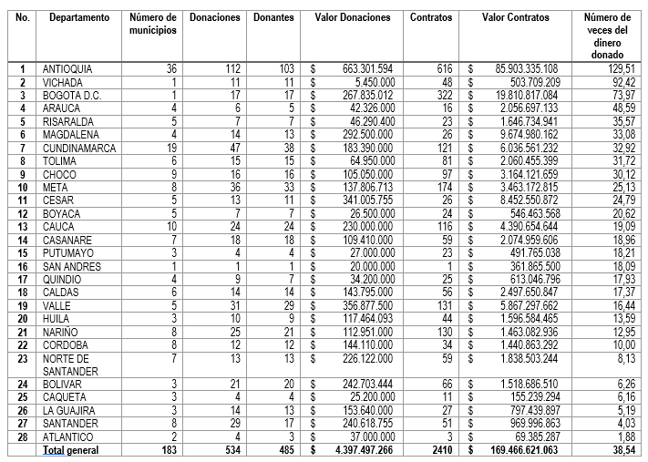 En cuanto a los departamentos, la investigación identificó que 18 de las 32 gobernaciones del país (56%) dieron al menos un contrato a aquellas personas que ayudaron a financiar sus campañas electorales. En estos departamentos se encontró que 62 personas naturales o jurídicas donaron 840 millones de pesos y recibieron 18 mil millones de pesos. Esto equivale a 22 veces el dinero donado.