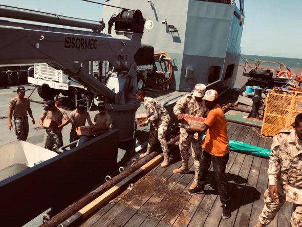 Estas ayudas, donadas por el Plan Mundial de Alimentos, fueron cargadas a bordo del buque en el muelle de la capital del departamento de La Guajira, por personal de la Armada Nacional, el Ejército Nacional y la Defensa Civil, para que nuestros hermanos Wayuu, cuenten con alimentos no perecederos e hidratación en este difícil momento.