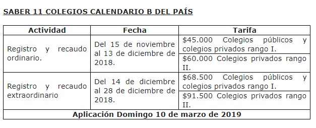 Las fechas y tarifas que deberán tener en cuenta, tanto los rectores de colegios oficiales y privados, como la ciudadanía en general interesada en inscribirse a la prueba Saber 11 Calendario B, son: