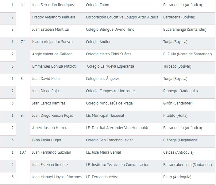 Antioquia, Santander, Boyacá, Atlántico, Cauca, Meta, Valle, Casanare, Nariño, Bolívar, Norte de Santander, Huila y Magdalena fueron los departamentos con ganadores en la final.