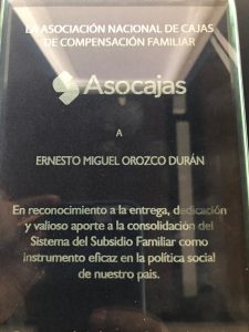 El reconocimiento que fue entregado en la última junta directiva del 2018, por parte la Asociación Nacional de Cajas de Compensación, Asocajas, destaca la entrega, dedicación y valioso aporte de Orozco Durán a la consolidación del sistema del Subsidio Familiar como instrumento eficaz en la política social del país.