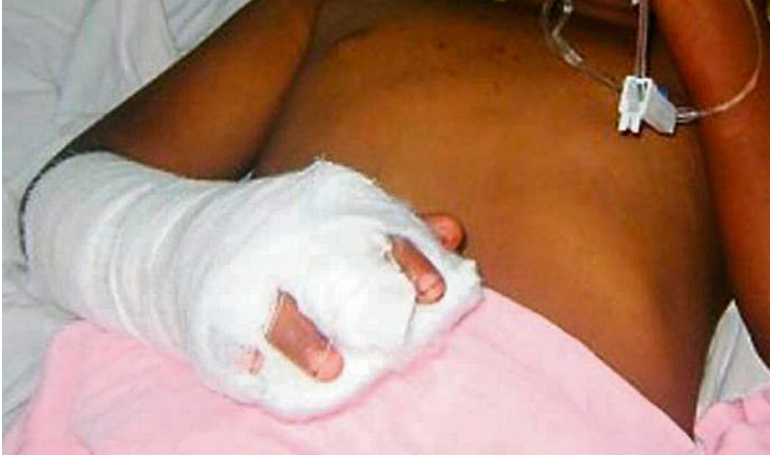 El menor presenta quemaduras de tercer grado y se le amputó el dedo índice de la mano derecha, según el reporte oficial del hospital Francisco Canosa de ese municipio donde fue recluido.