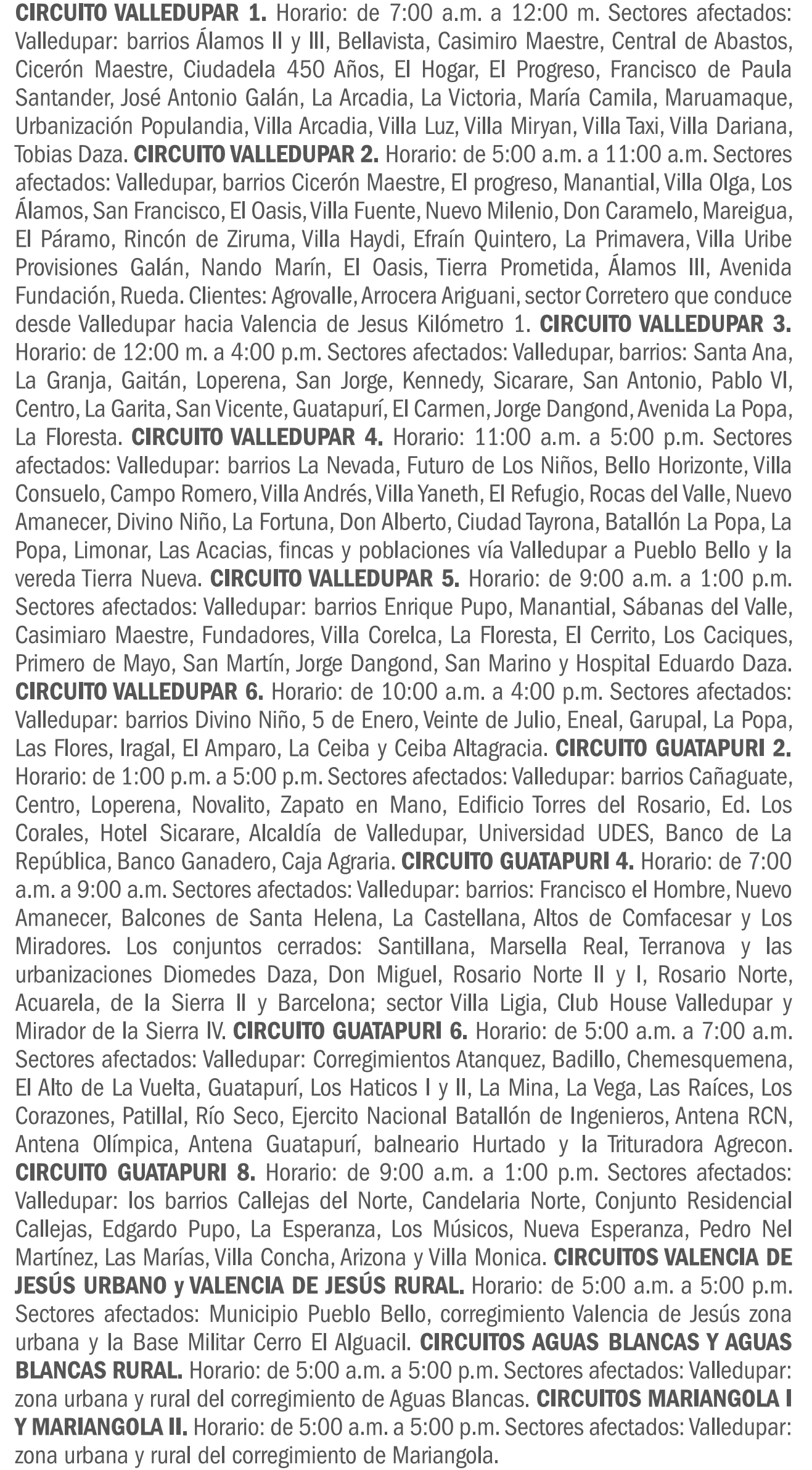 Para este domingo 3 de febrero, anuncian cortes de energía en barrios de Valledupar