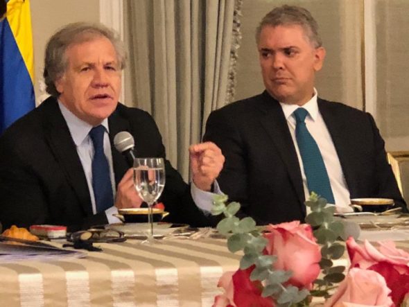 Almagro, quien en la noche de este jueves asistió en la Casa de Nariño a un encuentro con el Presidente Iván Duque y el nuevo Embajador de Venezuela en Colombia, Humberto Calderón Berti, señaló que se trata de trabajar por “la democracia hacia la democracia en Venezuela, por la paz hacia la paz en Venezuela”.