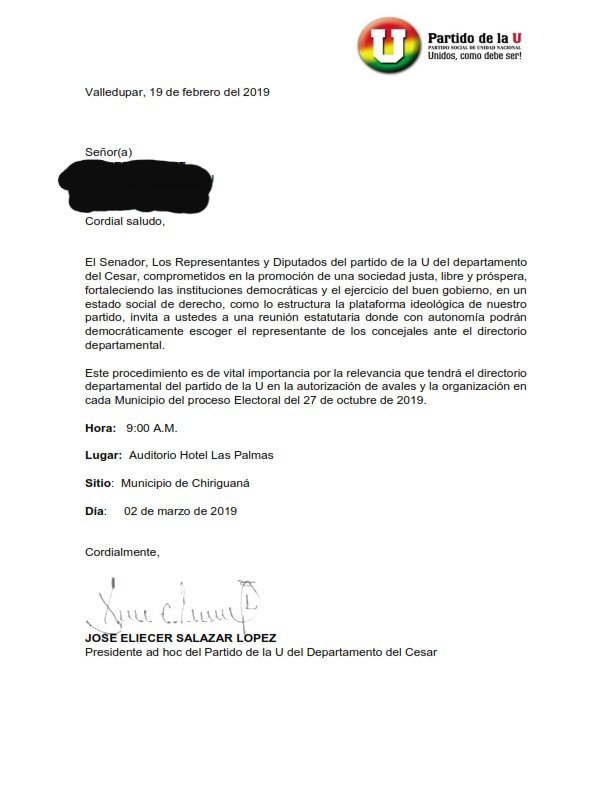 La carta que firma el congresista Eliecer Salazar como director ad-hoc del partido de la U en el Cesar invitando a una reunión para la organización del directorio en el departamento, generó una fuerte molestia al Representante de esa colectividad Cristian José Moreno.