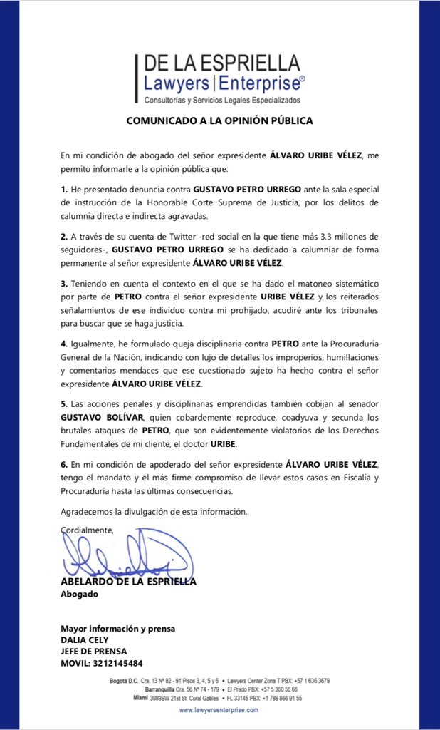 “Abelardo De La Espriella, como apoderado del expresidente @AlvaroUribeVel, presenta denuncia y queja disciplinaria, ante la @CorteSupremaJ y la @PGN_COL, contra los senadores @petrogustavo y @GustavoBolivar, por calumnia agravada”, reseña en la red social en la cual incluye este comunicado: