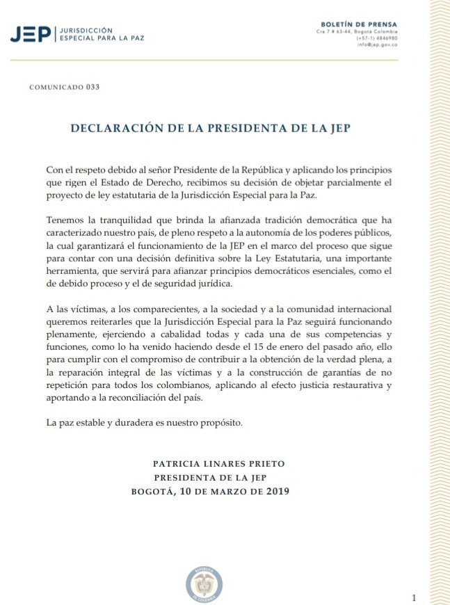 La presidenta de la Jurisdicción Especial para la Paz, JEP, Patricia Linares indicó que el tribunal recibe con respeto la decisión del jefe del Estado de objetar parcialmente el proyecto de ley estatuaria y advirtió que no será obstáculo para continuar sus funciones.