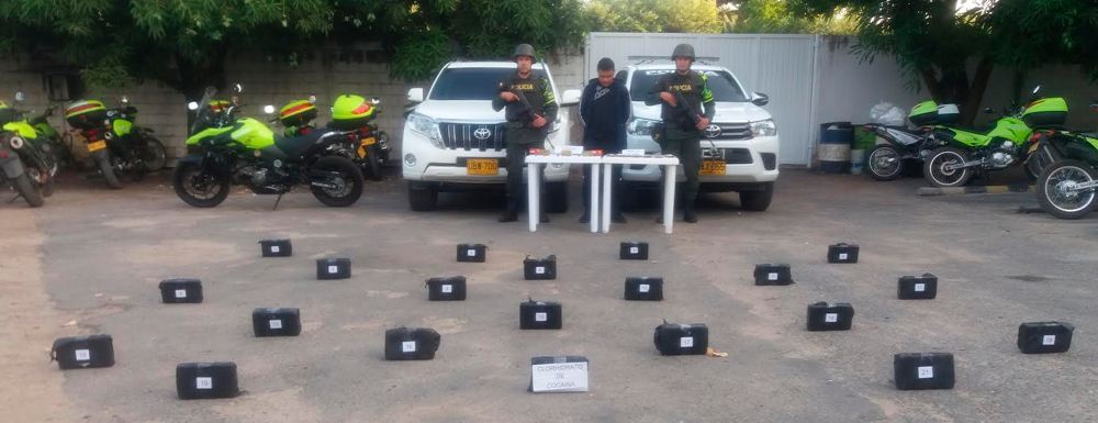 21 kilos de cocaína, municiones y directo en efectivos fueron descubiertos por la Policía durante un procedimiento de registro y control realizado en el sur del departamento del Cesar. Una persona fue capturada.