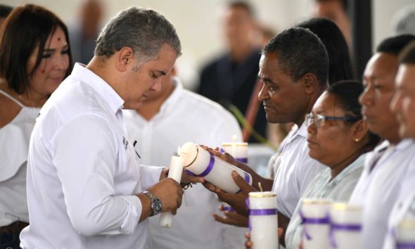 Un cirio que encendió, una a una, las velas que portaban los familiares de las víctimas de la toma de Mitú, y una sentida canción, fueron los símbolos que se utilizaron este sábado en el homenaje que encabezó el Presidente Iván Duque en memoria de las personas fallecidas en el ataque perpetrado por las Farc el 1° de noviembre 1998.